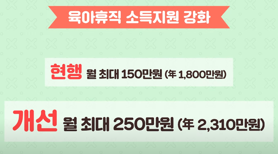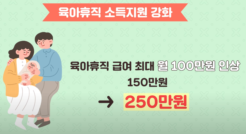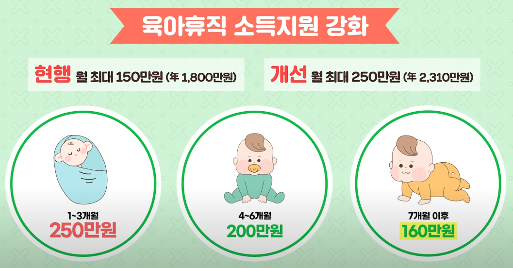 현재의 육아 휴직 급여는 1년간 매월 통상 임금의 80%로, 월 150만 원 상한을 지급하고 있습니다. 하지만 내년부터는 육아 휴직 수요가 많은 1-3개월 차에는 월 250만 원, 4-6개월 차에는 월 200만 원, 그 이후에는 월 160만 원 상한으로 지급할 예정이에요. 이로 인해 소득 감소 때문에 육아 휴직을 고민하던 많은 부모님에게 좋은 소식이 될 것입니다.