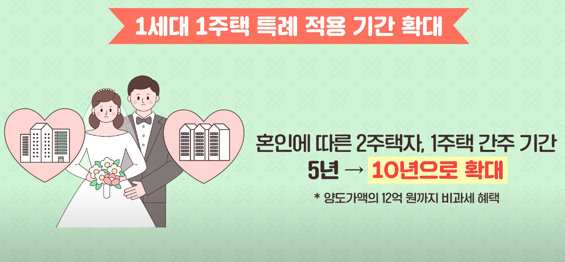 신혼부부를 위한 주거 지원도 강화되었습니다. 신혼부부에게는 청약 종합저축 및 이자 소득 비과세 혜택이 적용되며, 이 혜택은 무주택 세대주뿐만 아니라 배우자까지도 확대됩니다. 결혼 후 1세대 2주택자가 될 경우, 일시적으로 1세대 1주택으로 간주하는 기간도 5년에서 10년으로 연장되어, 주택 처분에 대한 부담을 덜 수 있게 되었어요.