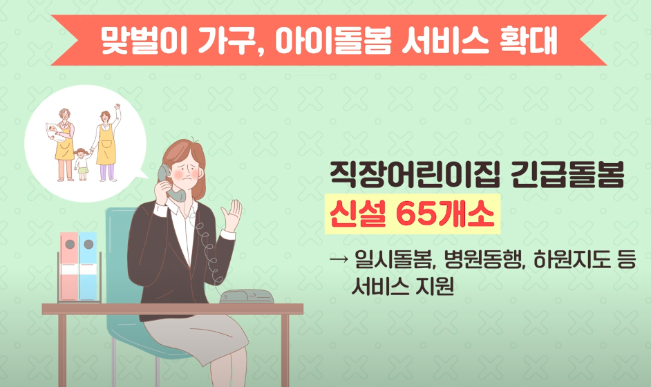 또한, 직장 어린이집 65개소를 대상으로 긴급 돌봄 서비스도 새롭게 신설되었습니다. 이 서비스는 일시적 돌봄, 병원 동행, 하원 지도 등의 도움을 제공해, 부모님들이 마음 편히 일할 수 있도록 돕습니다. 지원 대상도 기준 중위소득의 200% 이하로 확대되어, 약 1만 가구의 부부가 추가 혜택을 받을 수 있게 되었어요.
