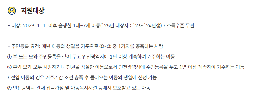 - 인천시 거주 기간: 신청자는 인천시에 최소 1년 이상 거주해야 합니다.