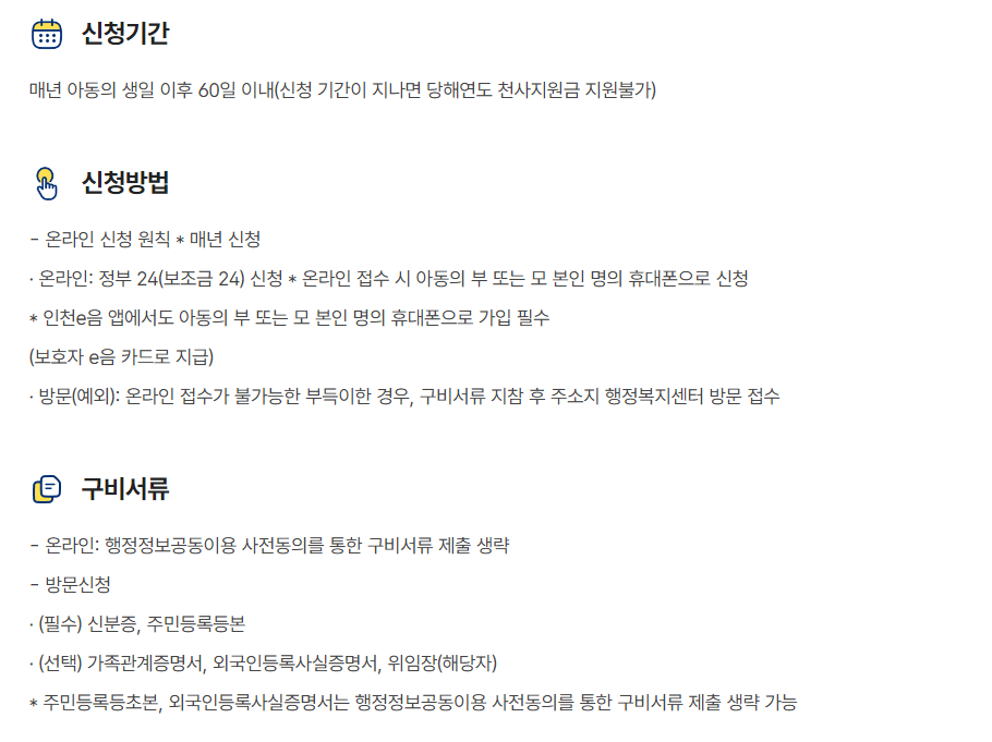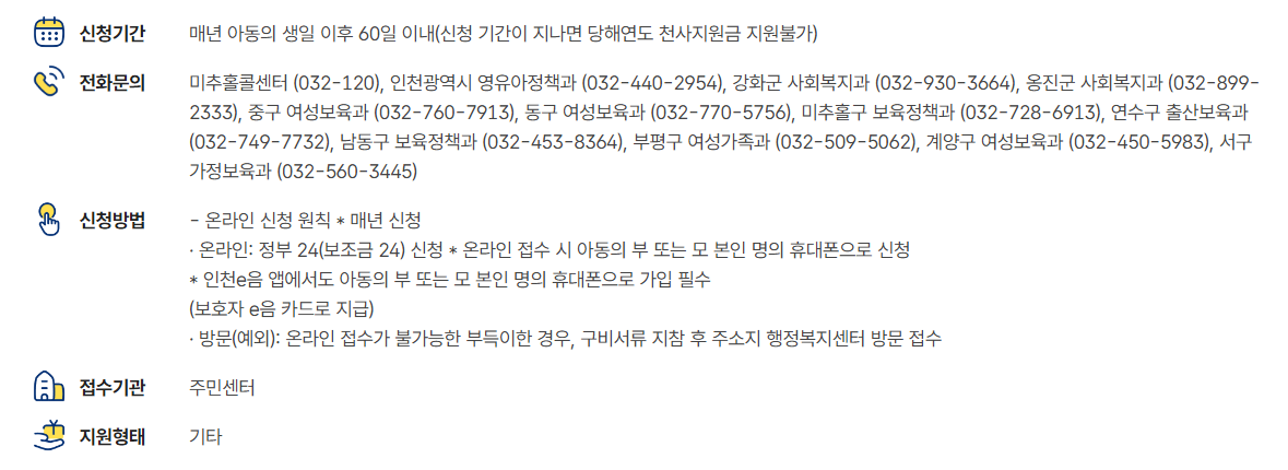 인천시에 거주하는 가정이라면 이번 기회를 놓치지 마시고, 천사지원금을 통해 자녀 양육에 필요한 경제적 지원을 받으시길 바랍니다. 여러분의 행복한 가정 생활을 응원합니다