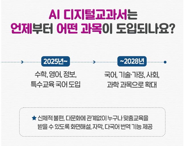 AI 디지털 교과서는 2025년부터 초등학교 3, 4학년, 중학교 1학년, 고등학교 1학년을 대상으로 도입됩니다. 첫 단계에서는 영어, 수학, 정보, 특수교육 대상자를 위한 국어 과목이 포함되며, 2028년까지 한국어, 기술, 가정, 사회, 과학 등의 과목으로 확대될 예정이에요. 학생들은 더욱 다양한 과목을 디지털 플랫폼을 통해 학습할 수 있게 되고, 교육의 접근성과 효율성이 한층 높아질 것으로 기대됩니다.