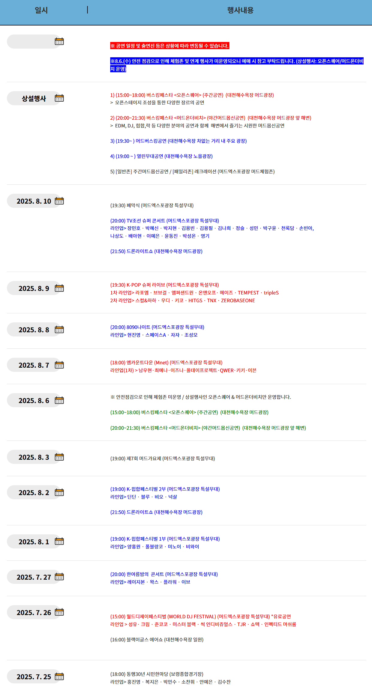 | 7월 26일(토) | 공군 블랙이글스 에어쇼, 월드DJ페스티벌 |