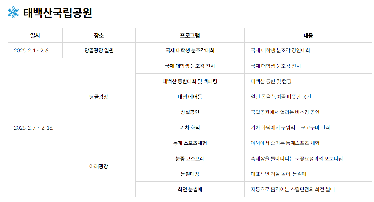 2025 태백산 눈축제는 2월 7일부터 16일까지 태백산 눈꽃 공원에서 열립니다. 이곳은 눈으로 덮인 아름다운 자연경관을 자랑하며, 축제 기간 동안 다양한 프로그램이 진행됩니다. 눈꽃 공원은 접근성이 좋아 대중교통을 이용해 쉽게 방문할 수 있으며, 겨울철 특유의 차가운 날씨에도 쾌적하게 즐길 수 있도록 다양한 편의시설이 마련되어 있습니다.