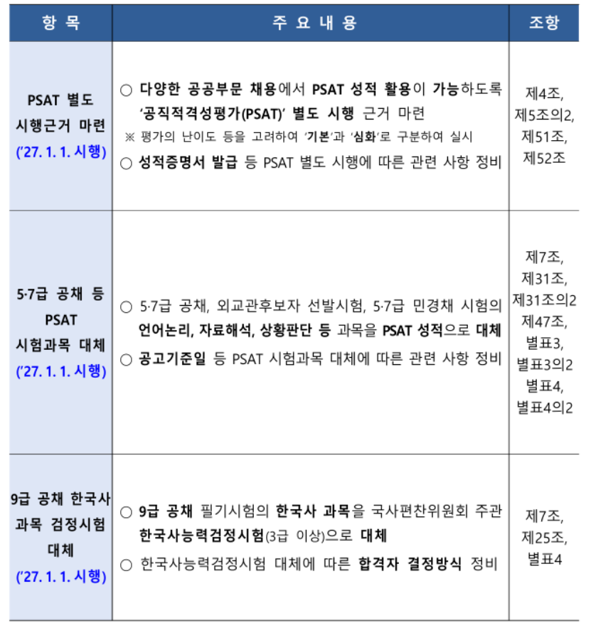 또한, 3차 면접시험에서 불합격한 수험생에게는 다음 회차 시험에서 1차 시험(PSAT)을 면제해 주는 규정이 신설됩니다. 이는 수험생의 PSAT 준비 부담을 줄이기 위한 조치입니다.