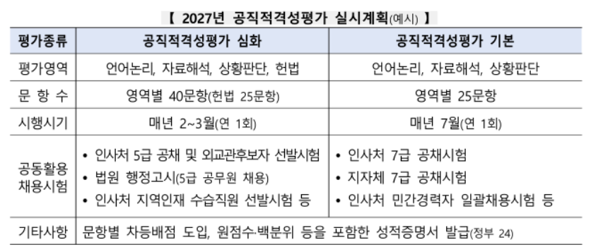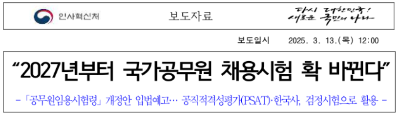현재 지방공무원 7급 공채시험의 국어 과목은 지식 암기 위주의 평가로 인해 수험생들에게 과도한 부담을 주고, 실제 직무와의 연관성이 낮다는 지적이 많았습니다. 이를 해결하기 위해 행정안전부는 2027년부터 국어 과목을 공직적격성평가(PSAT)로 대체할 예정입니다.