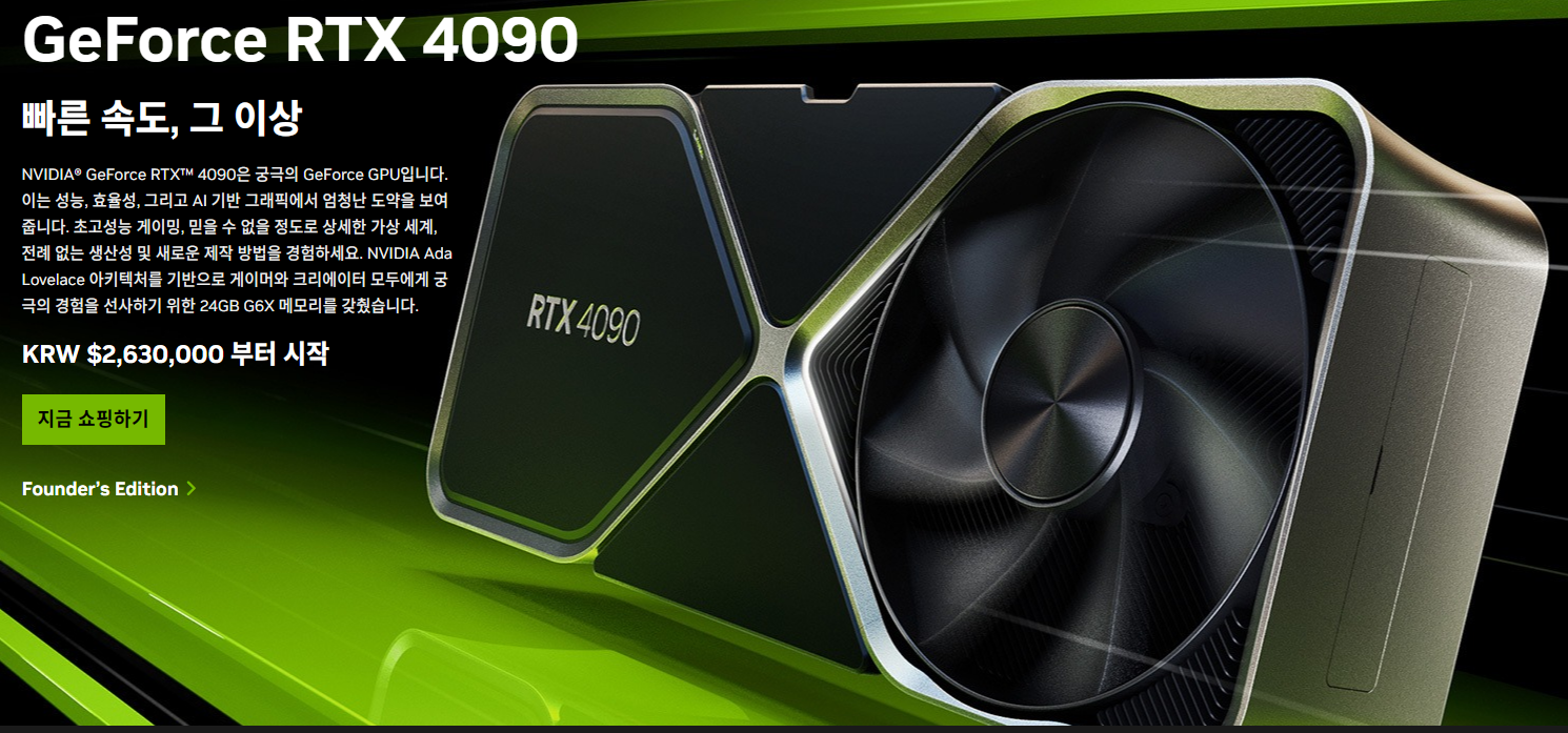 NVIDIA의 최신 플래그십 그래픽 카드인 GeForce RTX 4090은 최상급 성능을 제공합니다. AD102 아키텍처를 기반으로 하며, 24GB의 GDDR6X 메모리를 탑재해 높은 메모리 대역폭을 자랑합니다. 4K 게임 플레이와 고해상도 그래픽 작업에 최적화된 이 그래픽 카드는 Ray Tracing과 DLSS 3.0 기술을 지원해 더욱 향상된 그래픽 품질과 성능을 제공합니다.